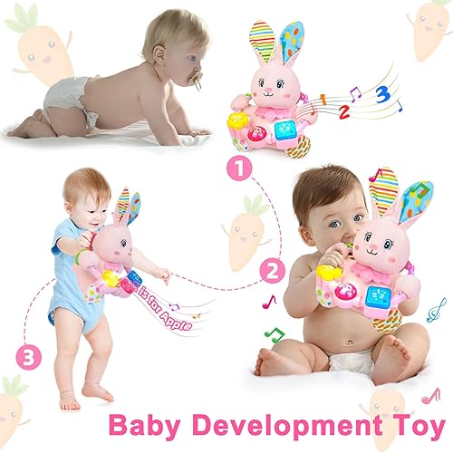 Built for Fun: An easy-to-grasp bead ring hangs around the baby rabbit toy.The bead ring has 3 buttons, Pressing these buttons activates flashing LED lights and learning of numbers 123,letters ABC, and playing 7 musical tracks. Additionally, there are 2 teethers located behind the grab ring, providing a variety of engaging experiences for babies.