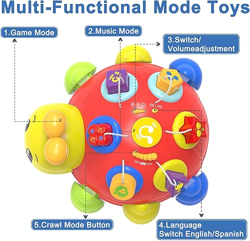 Infant Light-Up Musical Toy:Our ladybug baby toys offers bilingual educational advantages, supporting both English and Spanish modes. On the back of our Ladybug toy, there is a music button. Press the music button to play 9 children's songs.When the power is on, when there is a sound,the lights of the 8 buttons will turn on randomly the sound will stop and all the lights will be turned off.Helping baby develop visual & auditory skills,enhancing their attention and focus.