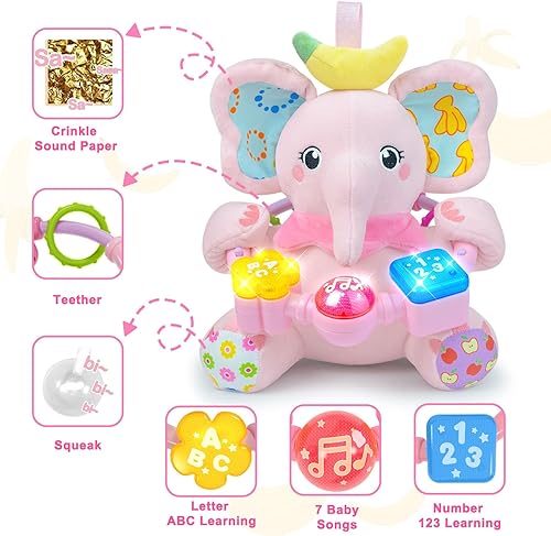 Built for Fun:An easy-to-grasp bead ring hangs around the elephant toy.The bead ring has 3 buttons, Pressing these buttons activates flashing LED lights and learning of numbers 123,letters ABC, and playing 7 musical tracks. Additionally, there are 2 teethers located behind the grab ring, providing a variety of engaging experiences for babies.