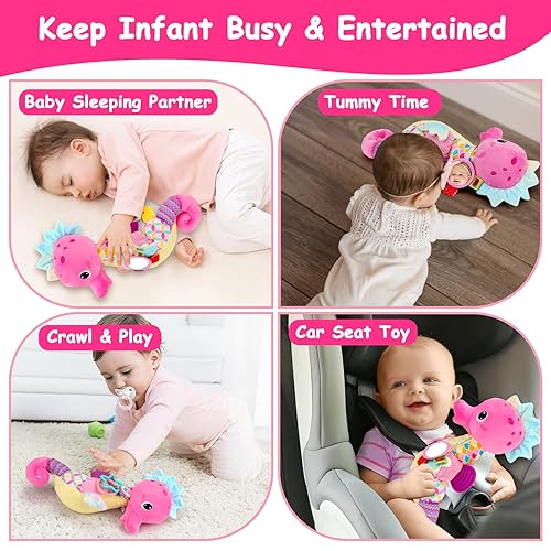 【Cute 6 In 1 Baby Seahorse Toy】The musical plush toy is designed for 0-3-6-12 months baby. We combine the music toy, plush toy, rattle toy, crinkle toy, baby mirror and teething toy into this pink seahorse stuffed animal. Multi color and multiple functional will bring the best sensory experience for newborn 0-6 months. Great baby partner for infant 0-3, 3-6 month toys developmental, new born baby essentials must haves, pink toys for baby girl 4 months old, montessori toys for babies 6-12 month.