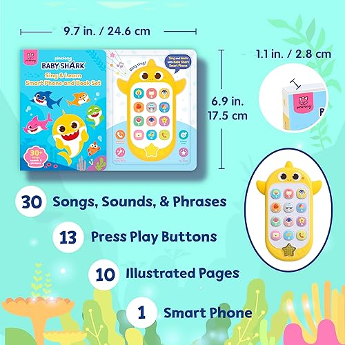 Official Pinkfong Baby Shark smart phone, complete with a mini lyrics book that complements the songs. Set features 12 press-play buttons plus a Star button that plays 9 popular nursery rhymes (Song Mode), counts from 0 to 9 (Number Mode), and also hears Baby Shark talk. Designed to enhance hand-eye coordination, cultivate sound, and color cognition during a crucial developmental stage.