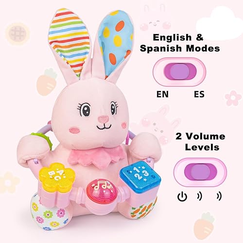 BABY SENSORY TOYS:There are three buttons on the cute rabbit baby toys with different music effects, numbers 123, letters abc and 7 baby music. Touching different buttons will trigger different sound effects and lights to attract the baby's curiosity and attention. It is specially designed for babies aged 0-6-12+ months to enrich their sensory experience.