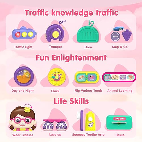 Montessori Multi-Function Car Toy: This montessori toy features over 30 engaging activities, including a pretend phone, driving simulation, cute animal window, number learning, 12 soothing baby songs, lights, and various life skill exercises. Each activity is thoughtfully designed to captivate and entertain babies for hours, sparking their curiosity, enhancing life skills, and helping them develop fine motor skills.