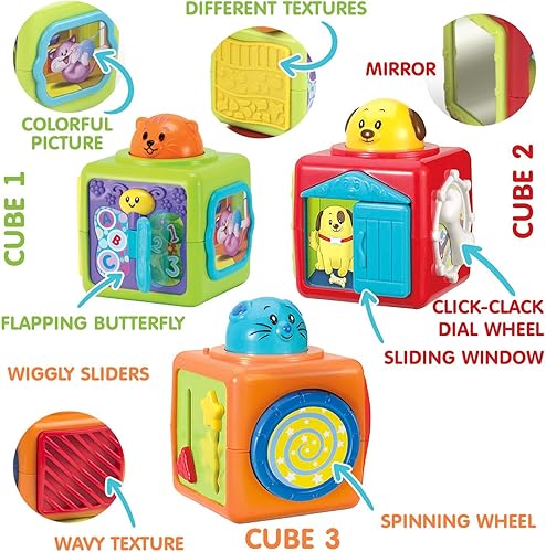 SET OF 3 TOY BLOCKS – Designed for babies and toddlers, this stack block set features 3 different baby activity cube toys, each with a quirky animal character and various fun elements to manipulate and interact with, including a mirror, rattle, sliders, spinners and more.