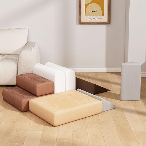 FUN & VERSATILE PLAY OPTIONS: This set includes 7 foam blocks, 2 of which are foldable and can be combined with others to create a comfortable sofa, or stacked into fun shapes like tunnels and forts. These foam blocks support your child's development through various stages: from helping babies learn to climb and walk, to offering older children a soft, cozy play couch or creative building options. Endless possibilities for imaginative play help develop motor skills, coordination, and courage.