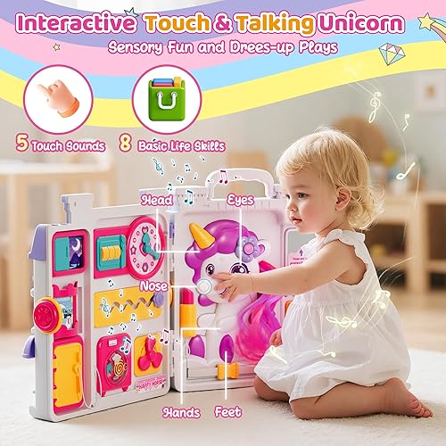 Touch & Talking Unicorn Busy House with Real Hair - Sensory Toys for Toddlers 1-3: Our unicorn is your child's interactive pet with 5 sensory touch points (head, eyes, nose, hands, feet) and real comable hair. This isn't just play; it's a crucial practical life skill activity that teaches grooming, tying shoes, wearing seatbelts, patience, and creativity—a beloved feature you won't find on any other busy board.
