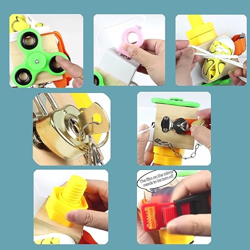 7-in-1 Montessori Toy - This quality wooden interactive toy includes fingertip gyroscope, anti theft safety lock and key, spring bolt, switch, universal wheel, water tap and rotating screw cap. Cultivate children's cognitive, attention and learning ability