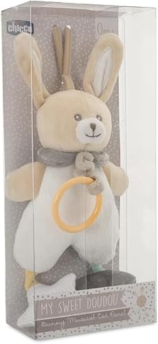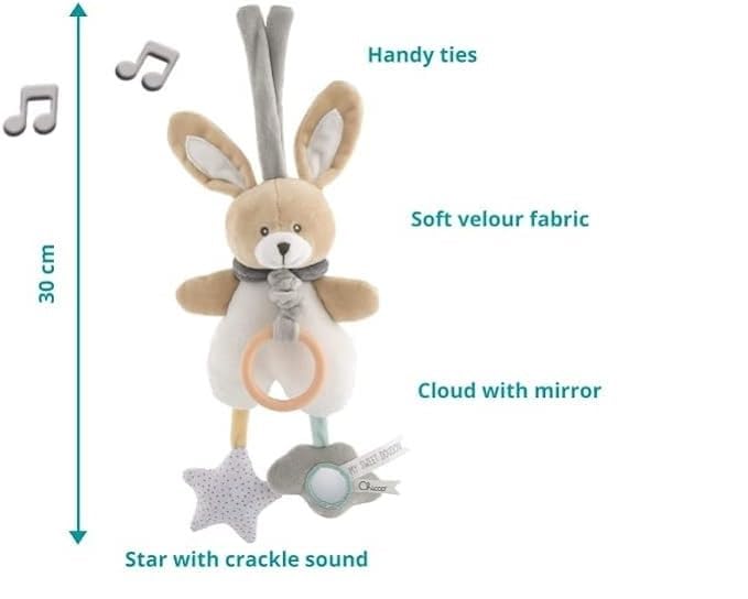 The rabbit music box from the My Sweet Dou range entertains and relaxes the little ones with a sweet melody and two hanging toys with mirror and crackle effect