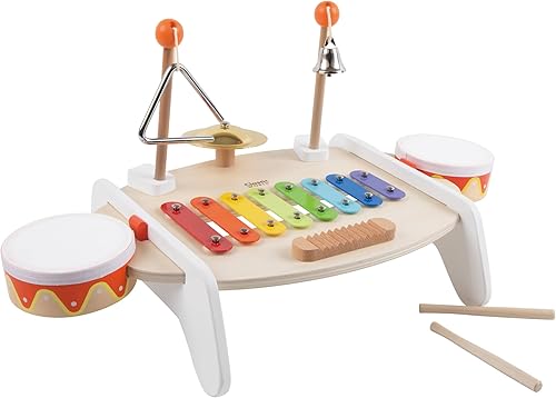 6 MUSICAL INSTRUMENTS IN ONE: The Classic World Wooden Music Table features a piano, two symmetrical drums with drumsticks, bells, a triangle, and scratchers, offering a variety of instruments for children to explore.