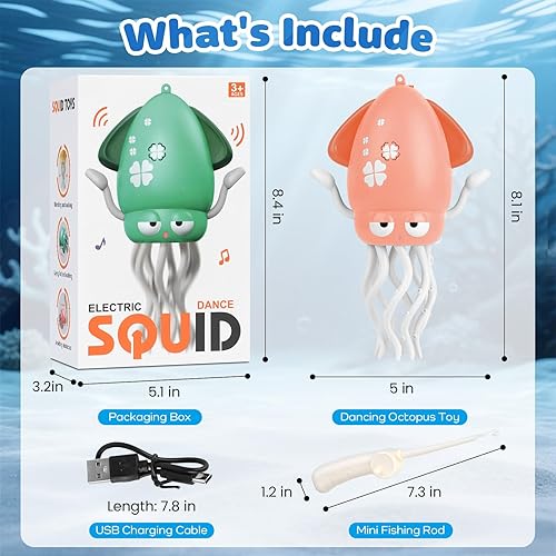 Funny Indoor & Outdoor Toddlers Tummy Toys: Equipped with an infrared sensor, it automatically avoids obstacles, we also included a reel-in fishing rod simulation function. It can dance in funny ways while standing, or move forward like a little car while lying down, this popular fish dancing squid attract babies 6-12 months attention