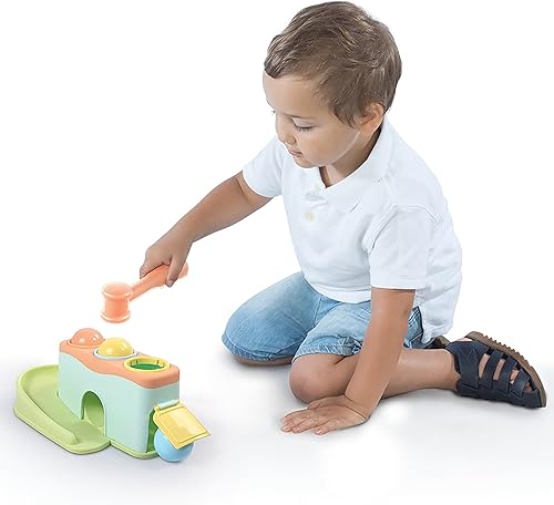 INCLUDES 3 BALLS, RAMP & HAMMER: Kids can pound each ball through the top and watch it roll down the ramp and come out from a different exit. Every tap brings motion, surprise, and excitement.
