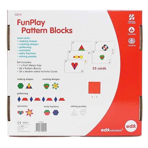 60 BLOCKS, 50 ACTIVITIES & TRAY -- This learning kit Includes 1 Messy Tray, 25 double-sided activity cards and 60 wooden pattern blocks in standard size and colors