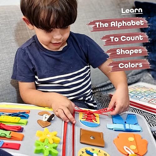 BUSY BOARD FOR TODDLERS 2-4: Our busy board montessori toys for toddlers is a great way to learn the letters of the alphabet, the numbers, colors, and shapes in a fun and engaging way (velcro and felt busy board) . Ideal toddler activity book.