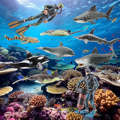 Shark Toys Divers Set: Our 8 pack includes a variety of sharks with 2 Divers: Whale shark, Sawtooth shark, Bamboo shark, Tiger shark, Killer whale, Hammerhead shark, Devil rays, Dolphin.