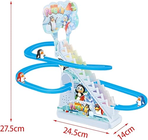 FLASHING LIGHTS AND MUSIC: Electric track slide toys comes with flashing LED lights and cheerful music, and penguins will stair with the music, and then slide down the slide.