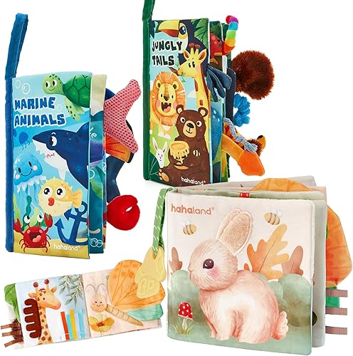 Colorful Pages: hahaland baby books 0-6 months feature bright, bold colors, friendly characters, and engaging patterns to attract your baby's attention and promote visual development; Babies will start to love touching them for the crinkly material and flipping through the pages, which helps them learn different types of words and colors. Multiple textures and surprise crinkles encourage exploration which makes it fun for babies and toddlers to discover, learn, and read