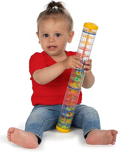 Baby shakes and flips the rain stick to watch the marbles come down and listen to the sound of falling rain
