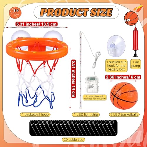 Night Lighting Design: designed specifically for basketball fans who take a bath at night; The LED light strip can be easily fixed on the basketball hoop with a tie; You can switch between 8 lighting modes at will; The basketball has a built in vibrating LED light, just tap it, and then it will illuminate, ideal size for little hands, easy to grab your little ones' attention to spend a fun bath time
