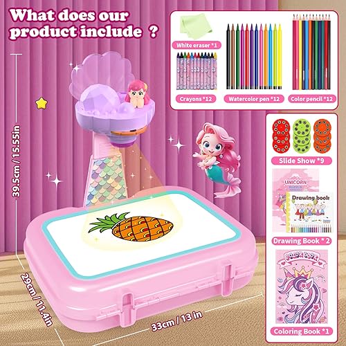 Package Contents - This extensive arts and crafts set for kids comes with a drawing projector table and a plethora of supplles to spark their imagina tion and nurture their artistic talents. The set includes 12 color drawing pens, 12 colored drawing pencils, 12 colored crayons, 1 drawing book, 1 sticker book, 9 projection discs, and a board eraser.