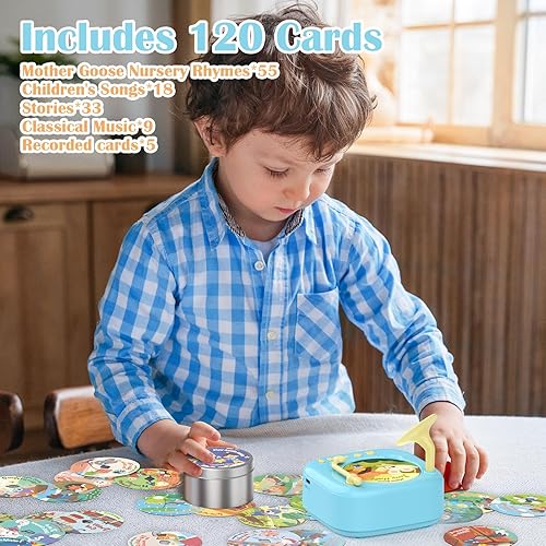 Value Pack: Includes a story player shaped like phonograph and 120 flashcards for stories and nursery rhymes (45pcs Mother Goose Nursery Rhymess + 33pcs stories + 28pcs children's songs + 9pcs classical music + 5 recorded cards), and 2 card storage boxes