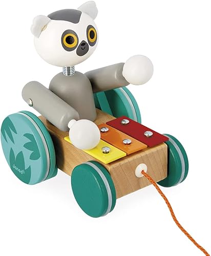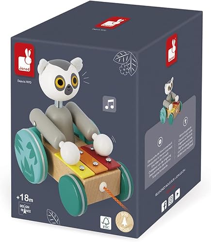 BABYS NEW FRIEND: This adorable lemur will accompany baby on all their adventures to the sound of their xylophone! This 2-in-1 toy will encourage toddlers aged 18 months and up to find their balance and help them learn to walk, little by little, whilst also contributing to their musical awakening. Equipped with rubber-coated wheels, this wooden toy is safe for indoor flooring. This beautiful Janod toy is a very nice gift that will be ideal for children aged 18 months to 3 years.