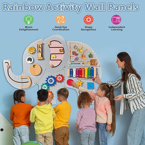 Complete Set: This elephant wall busy board includes 6 wooden wall panels measuring 13 x 7.8 inch (approx.) with the longest piece—the elephant’s trunk—measuring 14.2 x 6.3 inches. and 20 screws to form a delightful wooden activity wall panel. With a total height of 25.6 inches and width of about 35.4 inches, the playful elephant shape captures kids’ attention and adds a fun decorative touch. Made of quality wood, it’s a secure and durable option for everyday play.