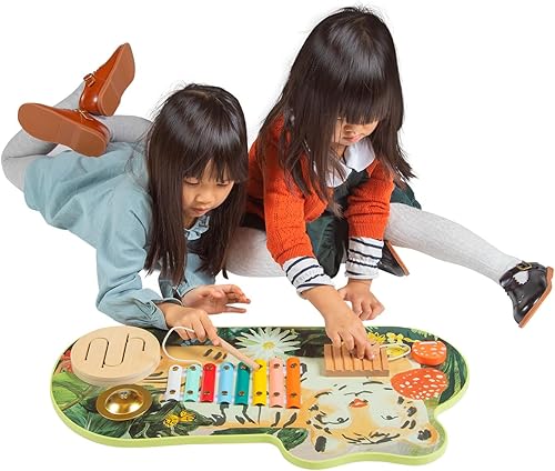 MUSICAL EARLY LEARNING TOY: The wooden Tiger Tunes toddler and preschooler toy embodies five instruments: an 8-key xylophone, a wooden drumhead, metal cymbal, mushroom clacker, and washboard sound maker. Attractive as nursery wall decor, music set for kids features artful illustrations and a tethered-on wood pick and mallet.