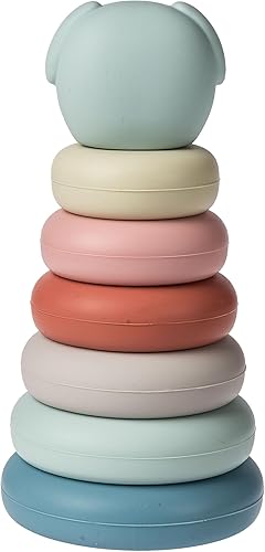 STACKING TOYS: Classic stacker toy includes 6 silicone rings and adorable puppy face topper, all in soft subtle colors