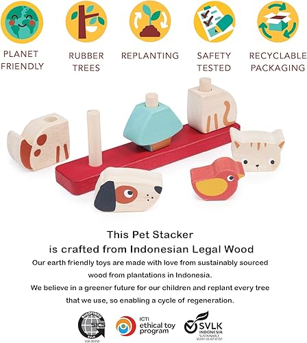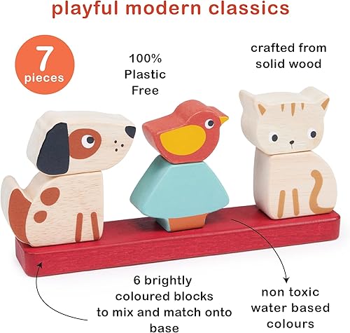 TOWER OF TAILS AND TRIUMPHS - Crafted from durable wood, the Animal Stacker is built to withstand enthusiastic play while offering hours of educational fun. The toy comes with a sturdy red base with 3 pegs and 6 shaped blocks for stacking and creating. Dimensions of 8.27 x 1.57 x 3.47 inches.