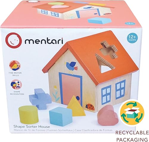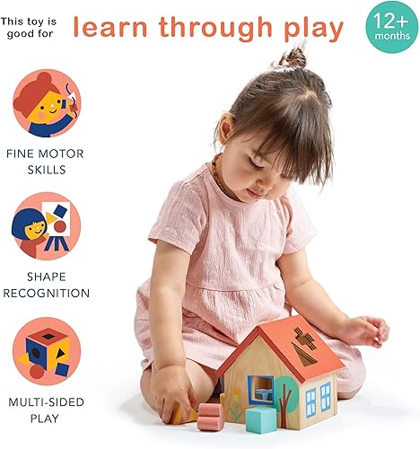 SHAPE SORTING FUN - Welcome to the cutest little house on the block! Our Shape Sorter House is a delightful wooden toy with a bright red roof and 5 chunky shapes to sort: a cylinder, cube, triangle, heart, and cross. Perfect for little hands and curious minds, this toy keeps the fun rolling from 12 months up. Removable panels make finding those shapes a breeze!