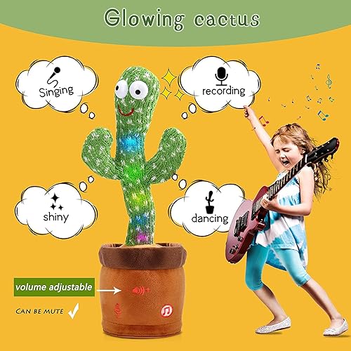 【Upgraded Version Cactus】: Volume Adjustable There are 3 button can control the funny dancing cactus toys. This Version Which Including Colorful Glowing Saving your Voice, Repeating, Dancing and Singing Functions. There are 120 songs in many language it can sing. The talking cactus can save what you say and repeat your words. Load the batteries and press the button. It will twist his body and glows when singing. It's really funny so try to speak something to baby cactus toy, which absolutely bri