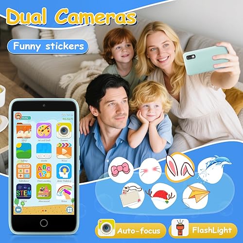 【Dual Camera Phone】:The toddler phone supports dual camera photography and video recording, just like real smartphone. With multi-cute stickers and frames, children can take funny and cute selfies, remembering beautiful moments and interesting experiences in life with family or friends.