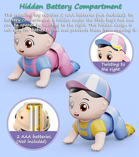 Hidden Battery Compartment: This crawling toy requires 2 AAA batteries (not included). Its battery compartment is hidden under the little boy's hat and can be opened by twisting to the right. This hidden design is not easy for babies to find and prevents them from opening it.