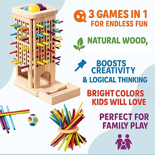 3-in-1 Montessori Balance Toy - Includes a wooden leaning tower, colorful sticks, rings, and balls for stacking, sorting, balancing, and counting activities that inspire creativity and early STEM skills.