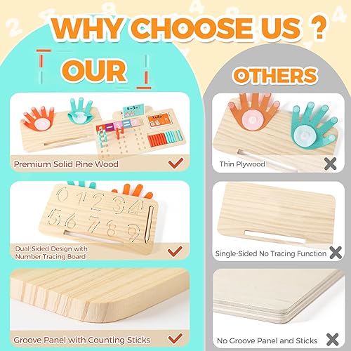 UPGRADED PURPOSEFUL DESIGN. MULTIPLE SENSORY EXPLORATION. Addition and subtraction games is designed for little hands, to help toddlers simplify addition and subtraction within 10. The Upgraded math toys for kids 3-5 features a double-sided wooden board:one side for counting manipulatives and the other for practicing number writing.