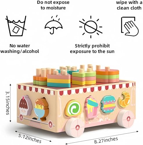 CLEAR THEME:This Montessori wooden toy car is ice cream themed, and the body decoration fully reflects its ice cream characteristics. The candy and ice cream patterns on the body of the car are brightly coloured and textured, making children feel like they are in a sweet ice cream world