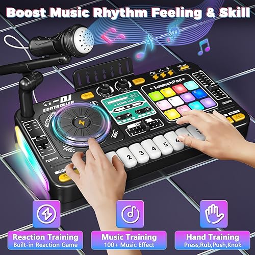 1. Ultimate Kids DJ Toy with Lights, Music & Endless Fun! - Turn your child into a mini DJ! This interactive DJ table toys features 100+ sound effects, music tracks, and 5 exciting modes (Piano Keys, DJ Turntable, Microphone, Reaction Games & more!). With colorful lights and dynamic sound combos, it creates a fun, immersive musical experience that sparks creativity and keeps kids entertained for hours