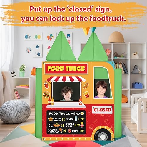 Package Includes: Your child will love the vibrant, food truck-themed play panel (33.6 x 36.6 in), featuring a "closed" sign panel (13.4 x 5.5 in), an elastic string, and a sheet of adhesive dots. This interactive play panel for play couch is great for sparking imagination and role-playing fun in any kids' playroom or home entertainment space.