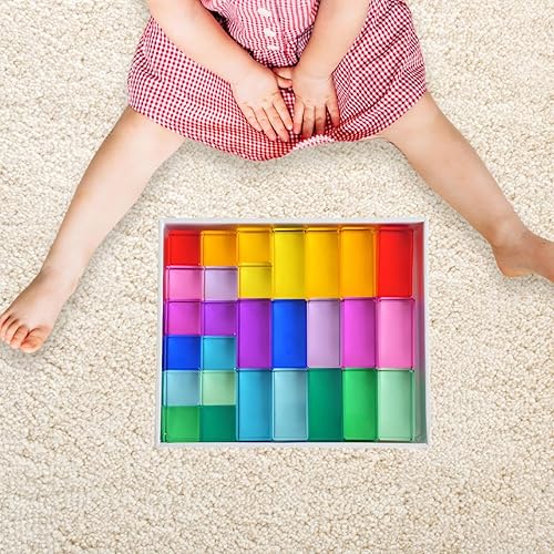 【Sensory Exploration】: Crafted from premium acrylic, these Rainbow Building Cubes feature brilliant clear colors. They captures and play with light, creating a stunning visual experience that stimulates your child's perception of color and sparks their curiosity about the world around them