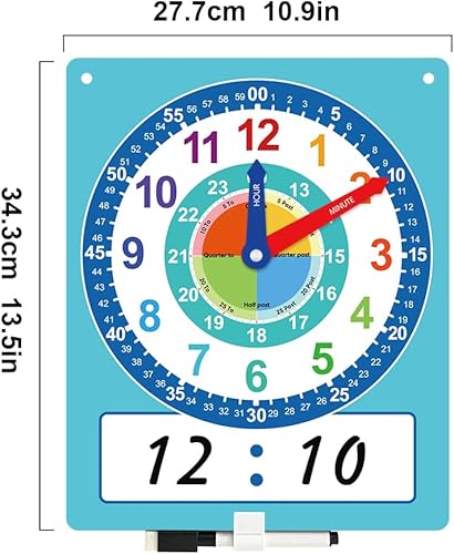Features: Comes with a hanging rope and magnet stickers, which can be easily hung on the blackboard or wall, or attached to a refrigerator or iron plate. The movable hour and minute hands can adjust the time at will. The erasable pen can record the time of the presentation. It can be used as a teaching aid for time teaching, or as a decoration at school or at home.