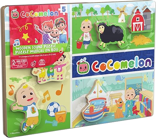 Plays Cocomelon Song: Thick, wooden puzzle pieces trigger the popular Cocomelon song. This puzzle requires two AAA batteries (not included)