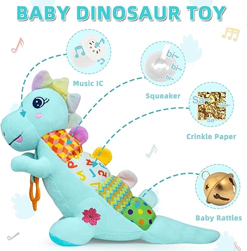 5 IN 1 BABY DINOSAUR TOY: Multi-Functional baby dinosaur plush toys combine the fun of crinkle sound paper,rattle, musical ic head, teether into this toy. Encourage tactile exploration for babies aged 0-6-12 months, let your baby experience different fun through cute dino toys.