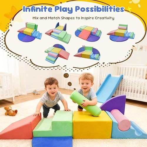 8-Piece Fun Set: Includes 2 stairs, 2 half-moons, 2 cylinders, 1 square, and 1 triangle slide. This colorful 8-piece foam set encourages climbing, crawling, sliding, and stacking, inspiring imagination, creativity, and interactive play. Ideal for toddler climbing gyms, indoor playsets, and kids’ soft foam blocks.