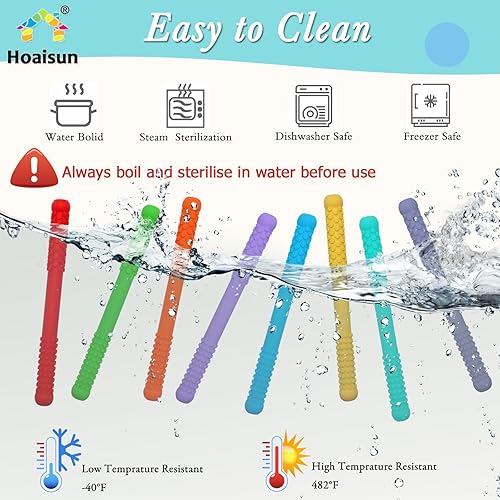 Easy to Clean - The hollow teething tubes comes with 2 brushes and is designed for a thorough internal clean. Silicone teethers are cold and heat resistant (-50°C-230°C), and dishwasher safe. Baby teething must haves. Choking Hazard Small Parts! The autism chew toys should be used under adult's supervision.