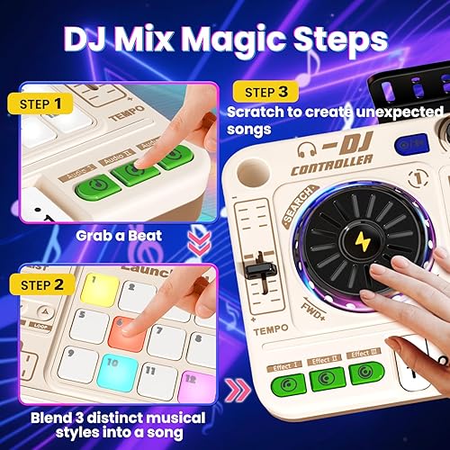 Multifunctional DJ Toy Sets: Our musical toys with 12 MIDI, DJ modes, sound effect speed control, volume adjustment, sound tuning and piano key. Packed with dynamic effects, it keeps kids engaged for hours of musical fun