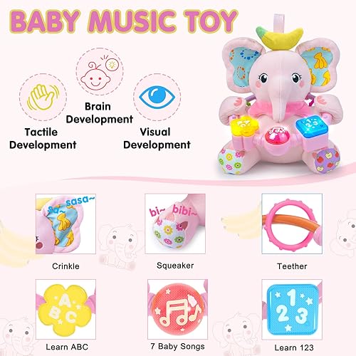 BABY BILINGUAL TOYS:This tummy time toys switches between English and Spanish to learn different music, numbers and letters with the elephant toy. This helps to develop early language learning skills, hand-eye coordination and exploration in a different and fun way, promoting cognitive development for babies 0-6 months.