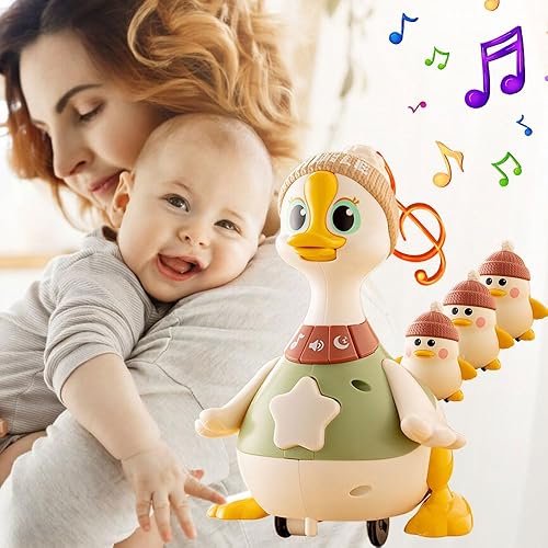 UNIQUE DESIGN: Cute duck appearance and soft light attract the baby's touch and playing. The mother duck toy can move and walk. The baby duck can walk alone or circle around the object. Multi-functional light up musical toys can bring unlimited fun for baby