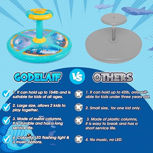 STURDY FOR SAFE PLAY - The newly upgraded ocean theme sit and spin toy is made of stronger materials, with a larger 17 inch (43.5cm) chassis and a powerful weight capacity of up to 154 pounds (70 kilograms). GODELAIF sit and spin provide energetic and worry free play for toddler, with smooth and rounded edges that allow 2 kids to sit and play together, making it ideal for toddler under the age of 10 and lighter adults.