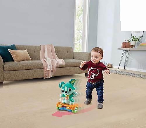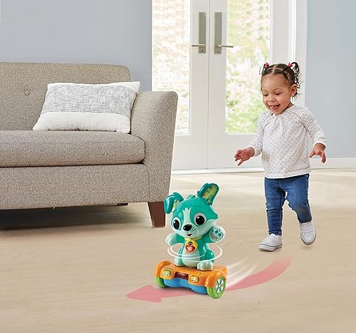 This cute little hoverboarding puppy rides around, encouraging your child to play with and chase them!