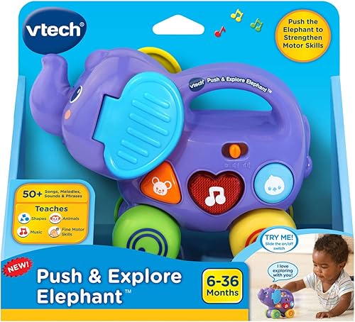 Push the friendly elephant to activate the motion sensor and hear playful sounds and short phrases, which introduce cause and effect